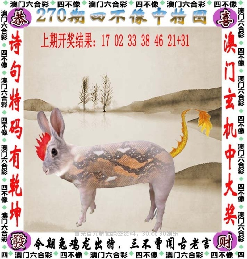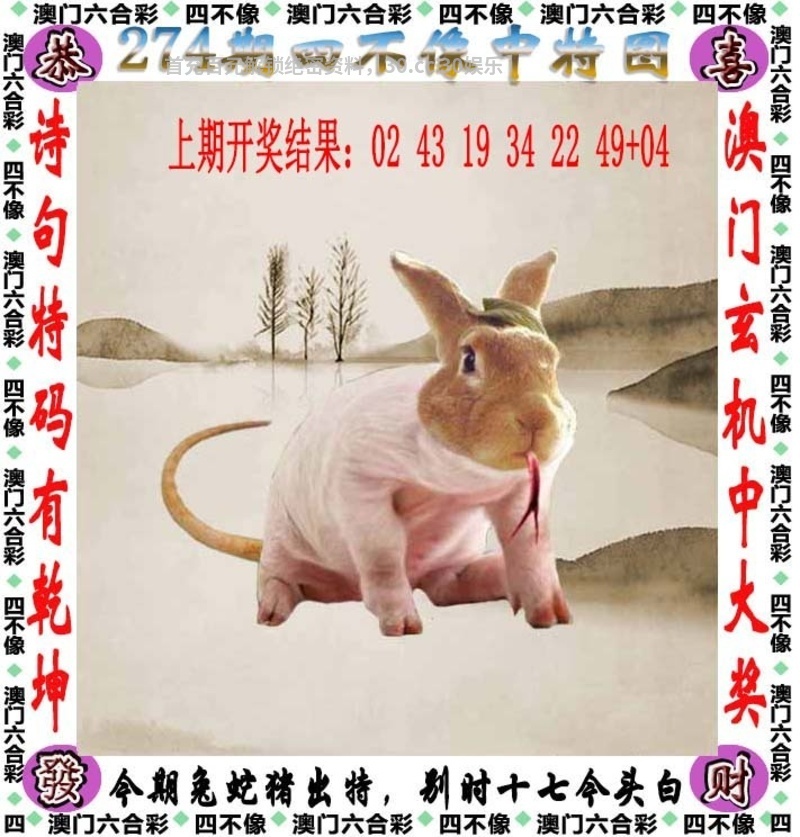 274期(今期兔蛇猪出特,别时十七今头白)开:狗44准 ①特肖:兔蛇猪狗马 ②合双+小数 |